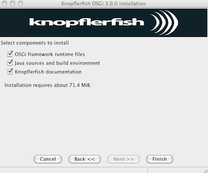 The Knopflerfish OSGi framework should be installed by simply running the distribution jar file, either by double-clicking on the distribution file, or by the command: